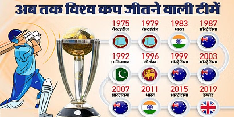 वनडे वर्ल्ड कप का आयोजन 13वीं बार होने जा रहा है। इससे पहले 12 बार हुए टूर्नामेंट में ऑस्ट्रेलिया ने सबसे ज्यादा पांच बार खिताब जीता है। टीम ने 1987 में पहली बार भारत में ही इंग्लैंड को हराकर ट्रॉफी पर कब्जा किया था। वेस्टइंडीज और भारत की टीमें दो-दो बार चैंपियन बनी हैं। पाकिस्तान, श्रीलंका और इंग्लैंड ने एक-एक बार खिताब जीता है। इंग्लैंड की टीम डिफेंडिंग चैंपियन है। उसने 2019 में घरेलू मैदान पर न्यूजीलैंड को फाइनल में हराया था।