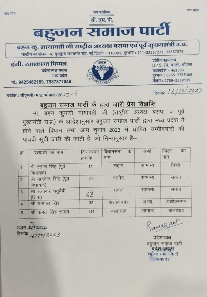 भोपाल। मध्य प्रदेश में आगामी विधानसभा चुनाव को लेकर सभी दलों ने अपनी कमर कस ली है। और पार्टी लगातार अपने उम्मीदवारों की घोषणा कर रही है। इस बीच बसपा (बहुजन समाज पार्टी) ने अपने उम्मीदवारों की पांचवी सूची जारी कर दी है। इस लिस्ट में 5 प्रत्याशियों का ऐलान किया गया है।